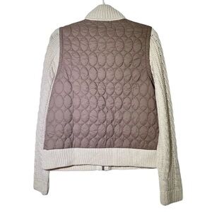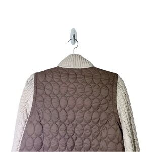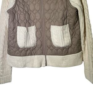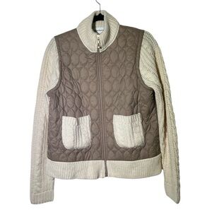 New with tags! Cream and tan mixed media jacket. Has a quilted, puffed, beige faux vest, and thick knit sleeves with a mock neck collar. Has small knit front pockets. Has a zip front closure. Has area on shoulder where knit is a bit stretched. Otherwise in good shape.