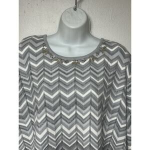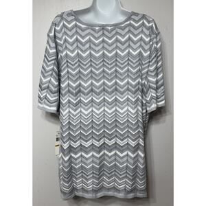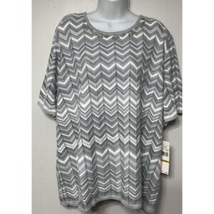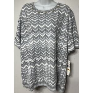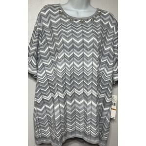 Alfred Dunner women’s plus size 3X short sleeve pull-over knit sweater. New with tags. No flaws. Chevron print of white, gray and silver sparkle. Decorative embellished neck line. Stretch.