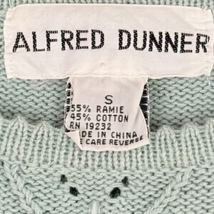 The Alfred Dunner Sweater is a stylish and versatile piece for women in size Small. This seafoam green sweater features a geometric pattern with eyelet embellishments, making it perfect for travel, casual outings, or even business meetings. Made from a blend of Ramie and Cotton in a tight-knit fabric, this lightweight sweater is designed with a round neckline and short cap sleeves. The vintage look, accented with beaded and embroidered details, adds a touch of cottage charm to this classic and spring-inspired piece.