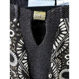 Stunning top for special occasions with metallic gold and cream design on a black sweater knit. Bodice has a pretty gold bead detail over a shallow v neckline.