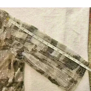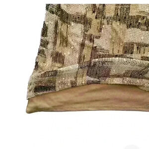 A tan cami with an overlay of tan, brown, and cream geometric mesh, with cream sequins detail for a subtle shimmer. 3/4 sleeve, round neck, hits at the hip, true to size. Gently worn, excellent used condition.