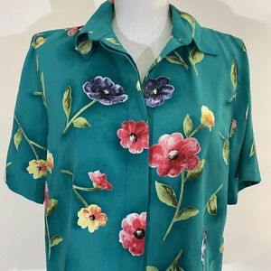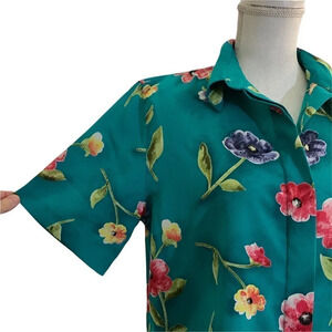 Alfred Dunner Teal Blue Floral Button Up Blouse Size 8 Colorful Shoulder Pads