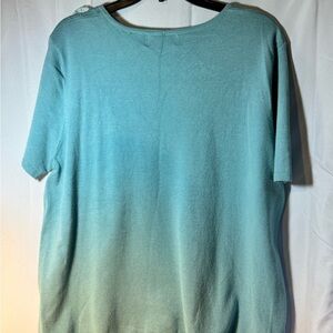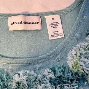 Beautiful Alfred Dunner teal sweater with unique textured floral appliqué and sequin embellishments around the neckline. Soft knit fabric with a relaxed fit, perfect for dressy casual looks or special occasions.