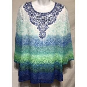 Alfred Dunner Top 18 Green Blue Ombré tie dye 3/4 sleeve flowy boho hippie