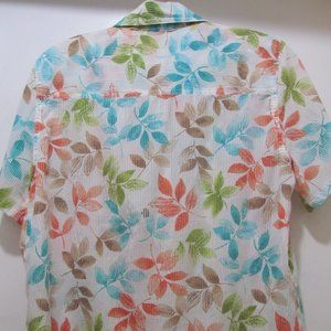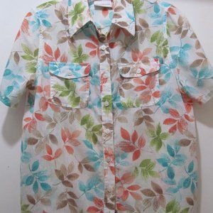 Alfred Dunner Top Shirt Blouse Short Sleeve Button Down Blue Green Orange Leaves