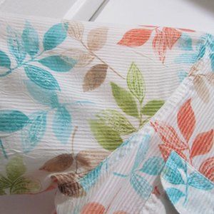 This is a really pretty top done in blue, green, orange-red, and brownish leaves against an off-white/ivory/muted white background!