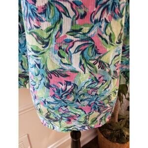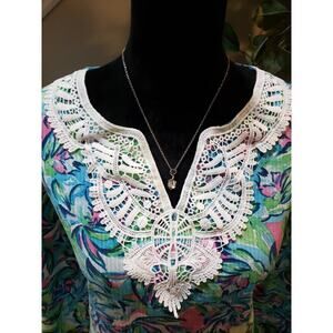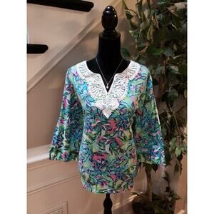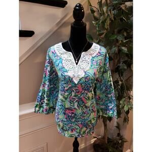 Add a burst of tropical charm to your wardrobe with this Alfred Dunner women’s top in size L. Featuring a vibrant multicolor floral print and elegant white crochet lace neckline, this tunic-style blouse is crafted from 100% cotton for lightweight comfort. The relaxed silhouette and 3/4 sleeves make it perfect for casual wear or vacation outings.