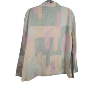 A beautifully crafted blouse featuring abstract pastel brushstrokes in mint, blush, ivory, and lavender with delicate floral appliqué details. Lightweight, breathable silk shell with button front, collared neckline, and full lining for comfort and structure.