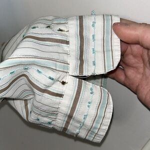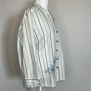 This Alfred Dunner top is in EUC with turquoise and brown stripes and floral accents with 3/4 sleeves.