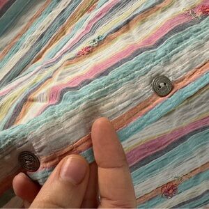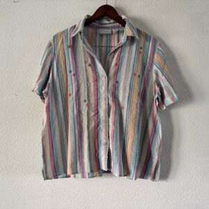 • features: this vintage Alfred Dunner short-sleeve button-up shirt exudes a charming cottagecore aesthetic with its soft pastel stripes in shades of pink, yellow, blue, and white. The delicate pastel floral embroidery scattered across the front adds a touch of grandmacore sweetness and a hint of boho flair. Its relaxed fit and breathable fabric suggest a comfortable, slow living vibe, perfect for a casual yet stylish look. Shirt is lightweight and made of 58% cotton. 41% poly, 1% spandex