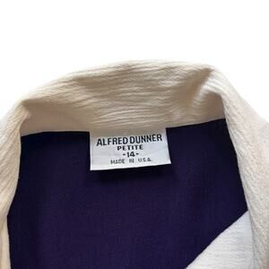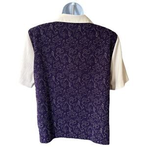 Vintage Alfred Dunner 2-piece set featuring a purple and cream floral print. Includes a short sleeve blouse and coordinating vest. Perfect for that classic 80s-90s look. USA made quality. Size 14 Petite.