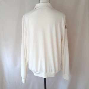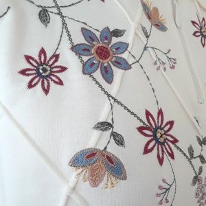 Collar neckline with a short front zipper. Diamond pattern detail at the front with beautiful, multicolored embroidered flowers at the chest. Tiny, crystal and tan beads on some of the flowers.