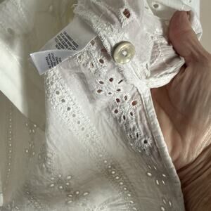 No defects, flaws, stains, rips, or tears. Excellent used condition. Very pretty embroidery design with eyelets and cut away bottom sides. Fits beautifully!