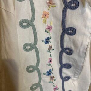 Add a touch of vintage charm to your wardrobe with this Alfred Dunner jacket. Features a crisp white base with pastel embroidered floral and loop detailing down the front, a collared neckline, and a full zip closure. Lightweight cotton blend makes it perfect for layering in spring or fall.