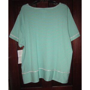 This listing is for a lovely and unique size 2X pullover tee shirt style knit top from Alfred Dunner Woman. The top is from the group name Classics 2025 and is done in a striped pattern in green and white with a beautiful embroidered and rhinestone decorated owl on the upper front center area.