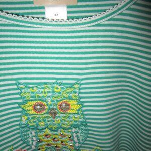 Alfred Dunner Woman Plus New 2X Knit Top Tee Shirt Striped Owl Embroidered Beads