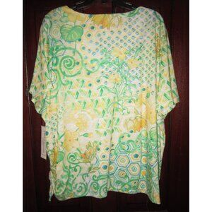 It has short sleeves and a V-neck collar with lattice like strips crossed over at the center dotted with rhinestones. The top is done in a pretty floral print in greens and yellows over white. It has short sleeves. This top is from the group Rise & Shine 2025 and is new with tags never worn. The measurements are: