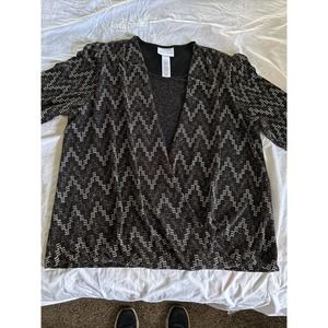 This Alfred Dunner blouse is a perfect addition to any wardrobe. The black top features a sparkly pattern with an asymmetrical sleeve and scoop neckline. It is made from a blend of polyester, nylon, and rayon, making it comfortable for all seasons. The gold shimmery metallic thread accents add a touch of glam to the pullover style blouse. Bust 44”. Waist 42”. Shoulder to tail 25”.