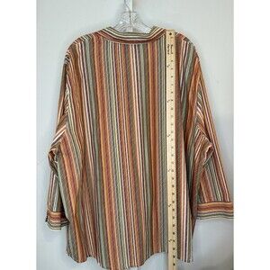 Upgrade your wardrobe with this new with tags Alfred Dunner womens shirt in size 24W. Featuring a vibrant multicolor diagonal stripe pattern in earthy tones of orange, red, green, and gold, this top offers a timeless yet modern look. Made from a breathable cotton-polyester blend, its lightweight, comfortable, and easy to care for.