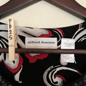 This Alfred Dunner Women's 3/4 Sleeve Embellished Stretch Sequin Tunic Top in size 3X is a stylish and versatile piece perfect for any occasion. Featuring a beautiful floral pattern in black, this pullover blouse has a V-neck and casual sleeves for a comfortable fit. Made from a blend of polyester and spandex, this top offers easy care and stretch for all seasons. The sequin accents add a touch of sparkle, making it a classic and colorful addition to any woman's wardrobe.