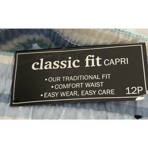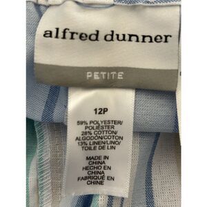 The Alfred Dunner Women's Blue & White Striped Elastic Waist Pull-On Capris in size 12P are stylish and comfortable pants perfect for traveling or casual wear. Made from a blend of polyester, linen, and cotton, these capris feature a high-rise and straight leg design. The pull-on closure with an elastic waistband ensures a perfect fit for women sizes 12P. With a classic blue and white striped pattern, these capris are easy to care for with machine washable instructions, making them a versatile addition to any wardrobe.