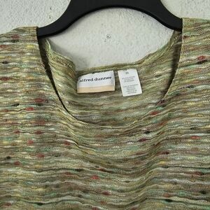 This Alfred Dunner women's knit sweater top is a must-have addition to your wardrobe. The pullover design features a round neckline and short casual sleeves, making it perfect for any casual occasion. The top is made of a comfortable acrylic poly blend fabric that stretches to fit all seasons and is easy to care for with hand wash only.