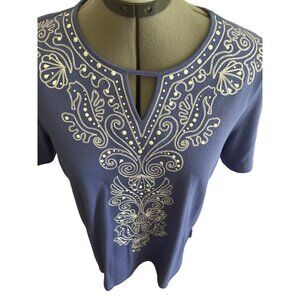 Alfred Dunner Womens Lavender Embroidered Top Short Sleeve Keyhole Chest, Small