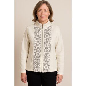 Alfred Dunner women’s fleece jacket in a medium petite size. White with gray embroidered panels down the front, accented with sequins for a subtle sparkle. Made of soft 100% polyester fleece, this cozy zip-front jacket is perfect for layering and has a timeless early 2000s look.