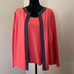 Women’s size medium Alfred Dunner one piece shirt/cardigan, the color is a pale red with gray trim, long sleeve with ribbing, polyester, cotton, spandex blend, great condition, no stains/flaws.