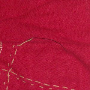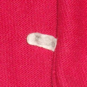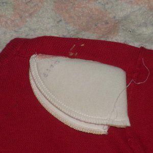 55% ramie 45% Cotton. It has shoulder pads, one red and one white. There are a few loose strings.
