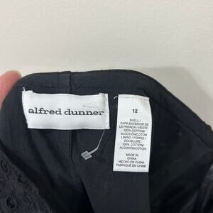 Alfred Dunner Womens Size 12 Black & White Floral Eyelet Lace Midi Skirt. The shell and lining are 100% cotton. The waist measures 34 inches and the length from waist to hem is 26 inches. There is a small white mark on the front waist, but in otherwise excellent condition.