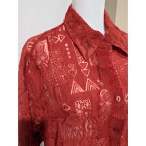 The product is a stylish Alfred Dunner Women's Size 16W Red Burnout Blouse Shirt Top Tunic. Made of lightweight and breathable polyester material, this geometric patterned blouse features a collared neckline, long sleeves, and a button closure. Ideal for casual occasions, it offers a regular fit and comes in a vibrant red color. Perfect for all seasons, this tunic blouse is a versatile addition to any woman's wardrobe.