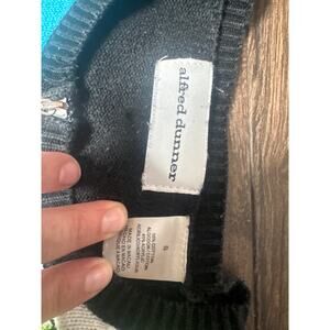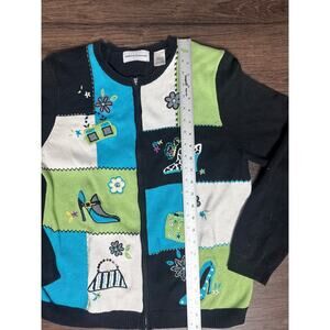 Add a touch of playful vintage charm to your wardrobe with this Alfred Dunner women’s size small cardigan sweater. This zip-up cardigan features a colorful patchwork colorblock design in blue, green, white, and black, decorated with embroidered fashion motifs including high heels, purses, flowers, and accessories.