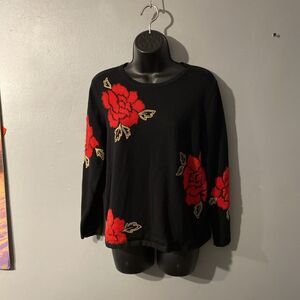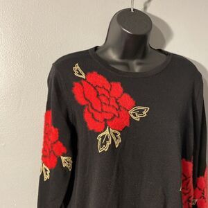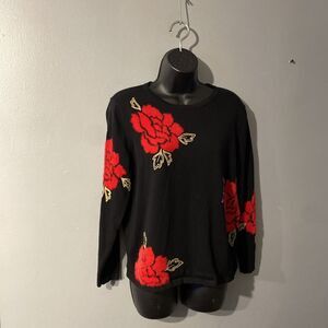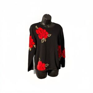 Alfred Dunner Womens Sweater Roses PM Black Red Cotton Nylon Lite Pullover