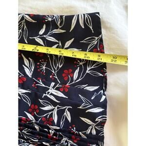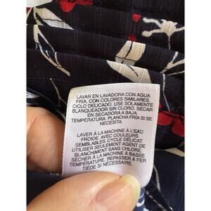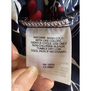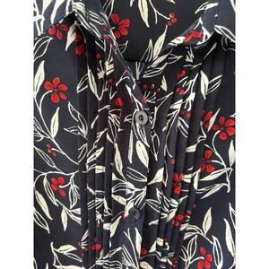 This Alfred Dunner Women's blouse in size 12P features a navy blue, red, and white print with leaves pattern. It has a collared neckline, short sleeves with button closure, and shoulder pads for accents. The blouse is made of lightweight, polyester fabric, making it suitable for various occasions like travel, casual wear, and business meetings. With a regular fit and basic style, this blouse is perfect for year-round wear in any season.