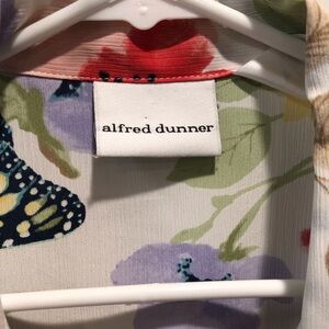 Experience the perfect blend of style and comfort with this Alfred Dunner blouse, featuring a vibrant blue and red watercolor-like floral pattern. Butterfly print. Ideal for casual outings, its lightweight fabric ensures a relaxed fit and breathability. Excellent used condition, non smoking.