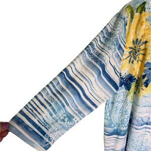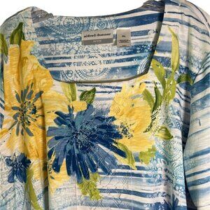 Live in comfort and style while wearing this cute Beaded Floral and Lace decorated top. Beachy or coastal style top by Alfred Dunner is a Size Petite XL. It is so comfy with three-quarter length sleeves and subtle white, blue and green patterns with silver beading throughout the garment. A square neckline with lace on the front completes the look. Measurements approximate. Bundle other items in my Closet for the best deal!