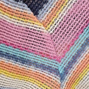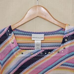 The Alfred Dunner Women's Top in size Small features a woven stripe design with metal neckline embellishments, making it suitable for travel and casual occasions. This knit blouse with a square neck and pullover closure offers a breathable and comfortable fit, perfect for the seasons of summer, fall, and spring. The blue top with short sleeves and studded accents adds a touch of art, rainbow, city, classic, and preppy themes to your wardrobe. Made from a blend of polyester and spandex, this top is machine washable for easy care.