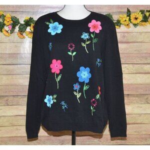 Alfred Dunner XL Black Pullover Crewneck Sweater Embroidered Flowers Long Sleeve