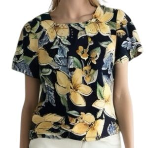 This stylish Alfred Dunner blouse features a fitted silhouette with short sleeves. The vibrant yellow and blue floral pattern adds a lively touch to any outfit, while the lightweight fabric ensures comfort throughout the day.