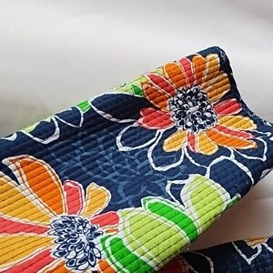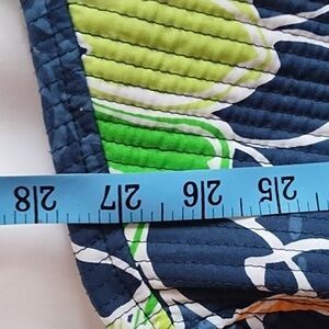 Open front. Very light.27 inches long. Navy blue with flowers.