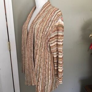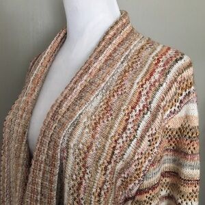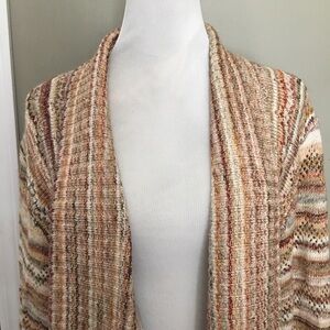 Alfred Dunner sz L open front cardigan sweater. Fall colors, long sleeves, knit, large lapel. Boho, Lagenlook, casual.