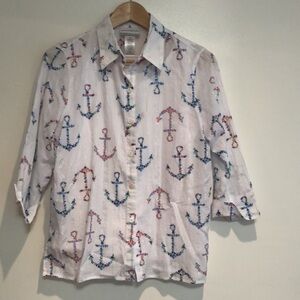 Alfred Dunner petit button up w/ floral anchor print and metallic stripes small