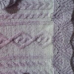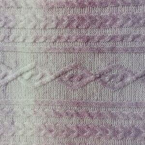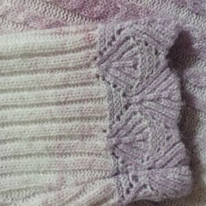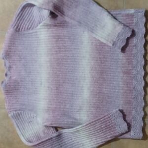 this is an absolutely beautiful sweater by Alfred Dunner it is a small petite it is tie-dye which I absolutely love in purple and white it's got beautiful cable knitting going all down the front of the sweater it has a nice scalloped collar and it's got that same scalloped on the edges of the sleeves and on the bottom of the sweater which is in the doctor of the purples it goes from a purple to a white to a pinkish purple to a white it's really so pretty it's very very soft it's made from 47% polyester and 53% acrylic no itch to it at all nice and soft very good quality the measurements on this sweater are lying flat approximately pit to pit 20 in and the length is 22 in and the sleeve from the tip of the shoulder down is 22 in in excellent condition