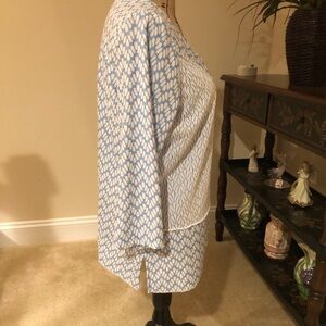 Beautiful blue and white print tunic length top in polyester and spandex Machine washable In excellent condition