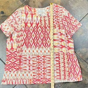 Alfred Dunner Abstract Geometric Diamond Top 2X. The top is missing some beads around the collar. There is a small hole under the arm pit. Please see photos. Measurements in photos. In good, pre-loved (used) condition.