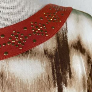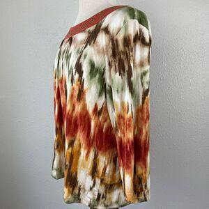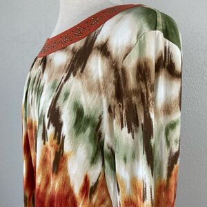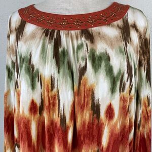 Love the amazing colors and print on this top in excellent preowned condition and measuring 21 inches armpit to armpit laying flat and 22 inches in length from shoulder to hem.