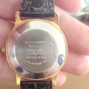 Alfred Hitchcock profile watch, gold case and brown strap. Does need a new strap as well as a new battery. Made by Image Watches, Inc California