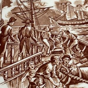 Vintage set of four lunch plates in excellent vintage condition- only one small blemish underneath one plate- see pictures. USS Constitution engaging a Chinese junks in 1830 in the Canton Port of New York Harbor. Historical Plates. Staffordshire with slight scallop edge for nice detail.