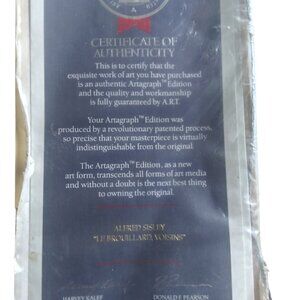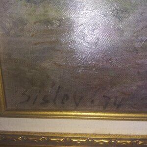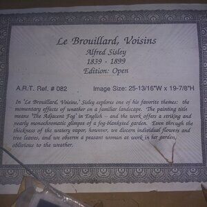 Pre-owned Alfred Sisley Le Brouillard Voisins Framed Painting, in good condition. There is some wear, ripping paper, on the back of painting. Please see all photos for artworks general pre-owned condition and measurements.